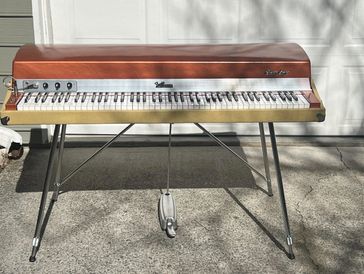 This is a 1973 Fender Rhodes 88 key stage piano that was taken down to the foundations and rebuilt. It has new tolex similar to an old Fender Amplifier. And it has been converted to active electronics from Vintage Vibe. The piano has all new hardware throughout plus significant improvements to the piano action.