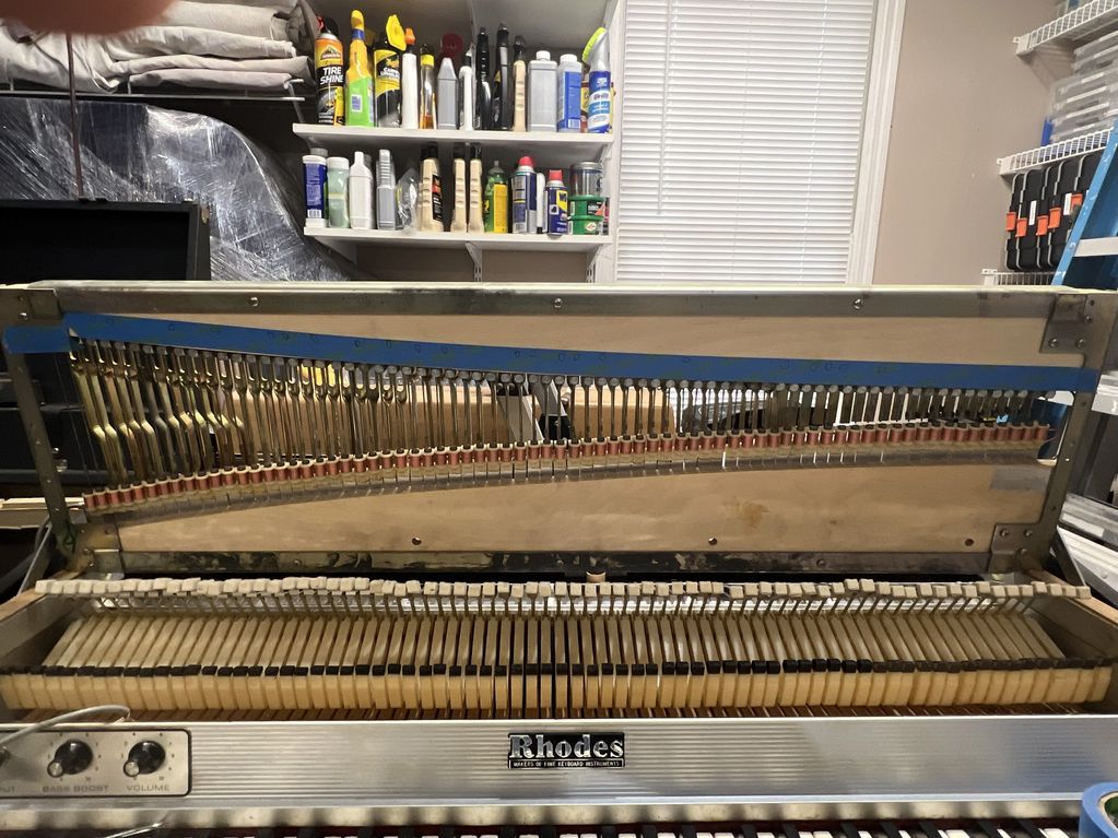 Once the tone bar assemblies and renovated pickups are installed, the next tasks are to ensure the key height is correct and the key dip is within tolerance. Notices the bright screws on the tone bars. Those are the Grommet screws.