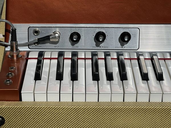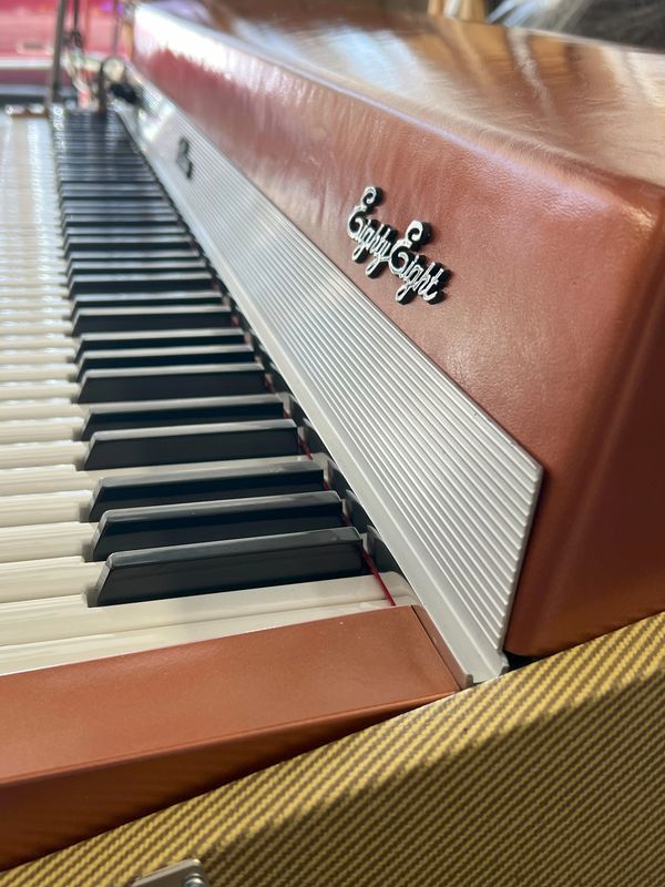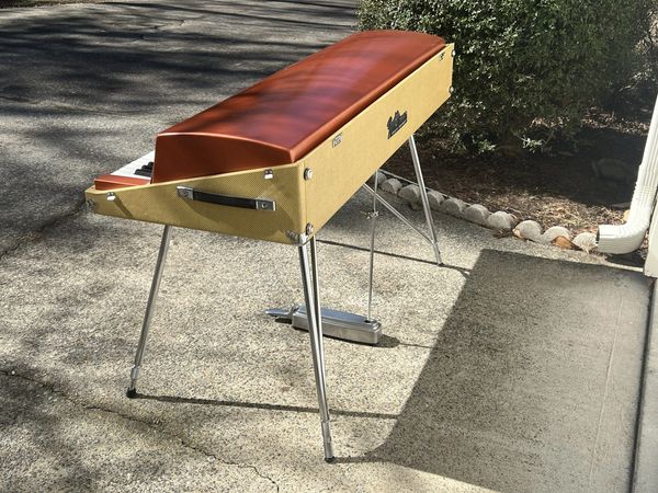 This is the starting point. A 1973 Fender Rhodes 88 key stage piano. The Tolex is dry rotted and the top is scratched up. The hardware is scuffed or tarnished and does not look all that good. The piano does have new hammer tips, Damper felts and a stereo preamp from Vintage Vibe already installed.