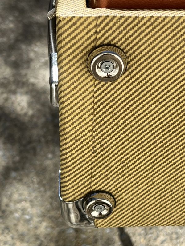 After the Tolex is applied and has dried, the new hardware is applied. When the old hardware was removed, measurements were taken and then used to mount the new hardware.