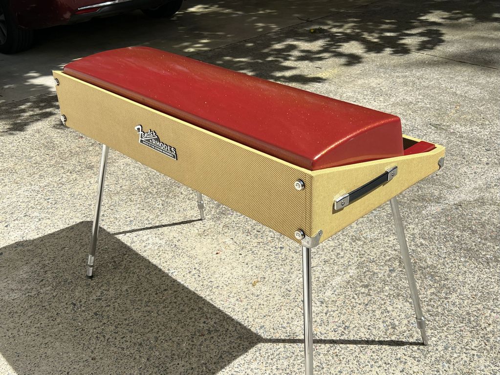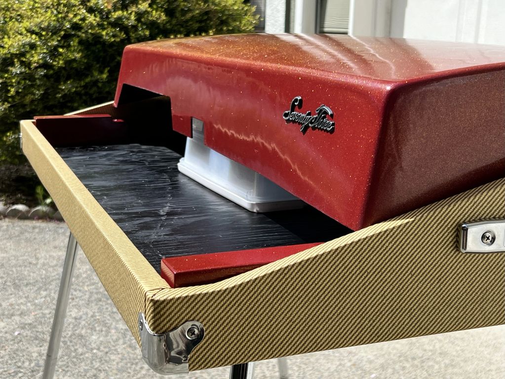 The case and top were done for a gentleman in New Orleans. It involved removing the old Tolex and installing new tweed Tolex on the bottom of the case. The top was painted Royal Red with metalflake added to the paint. It was then top coated with several coats of clear coat. Then all the hardware was replaced with new hardware. Once it was completed, the parts were crated and sent back to New