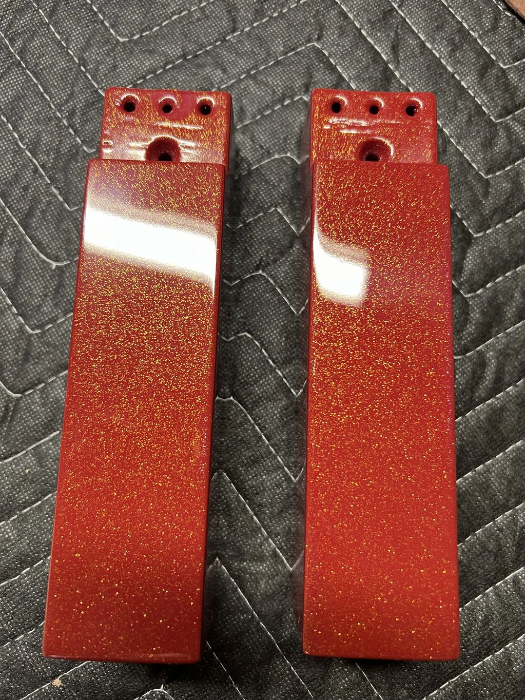 Look at the fire in these cheek blocks! This is the result of sanding the blocks smooth, using a plastic spray primer, then several coats of base paint and metal flake, and finishing it off with several coats of clear coat.
