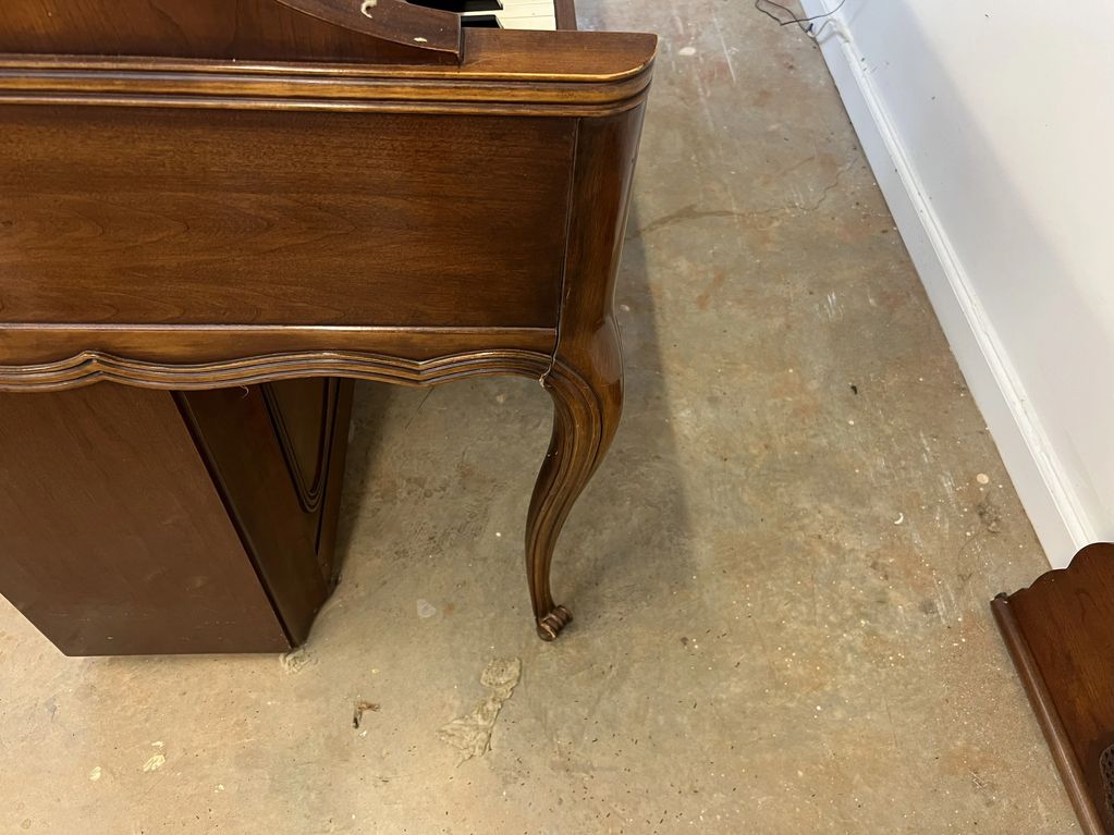 The broken leg has been repaired, the casters replaced, the case has been cleaned and polished. The music rack is needing to be mounted.