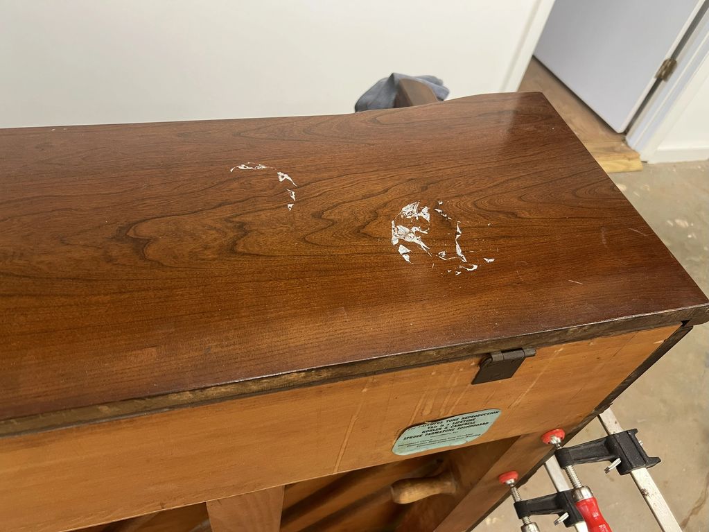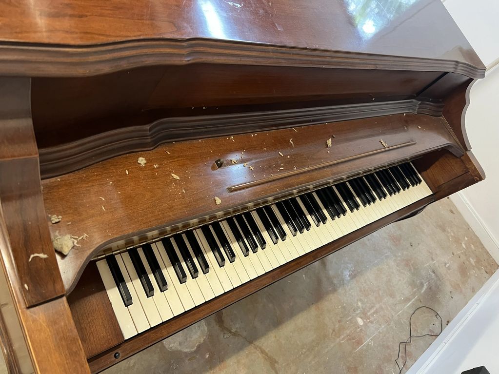 The top of the piano has been polished to remove the paint drips and to minimize the scratches. the piano was given a good cleaning and polishing on the rest of the piano. The piano got a good cleaning inside and out.The broken leg is repaired, and the music desk is the last thing to mount on the piano.